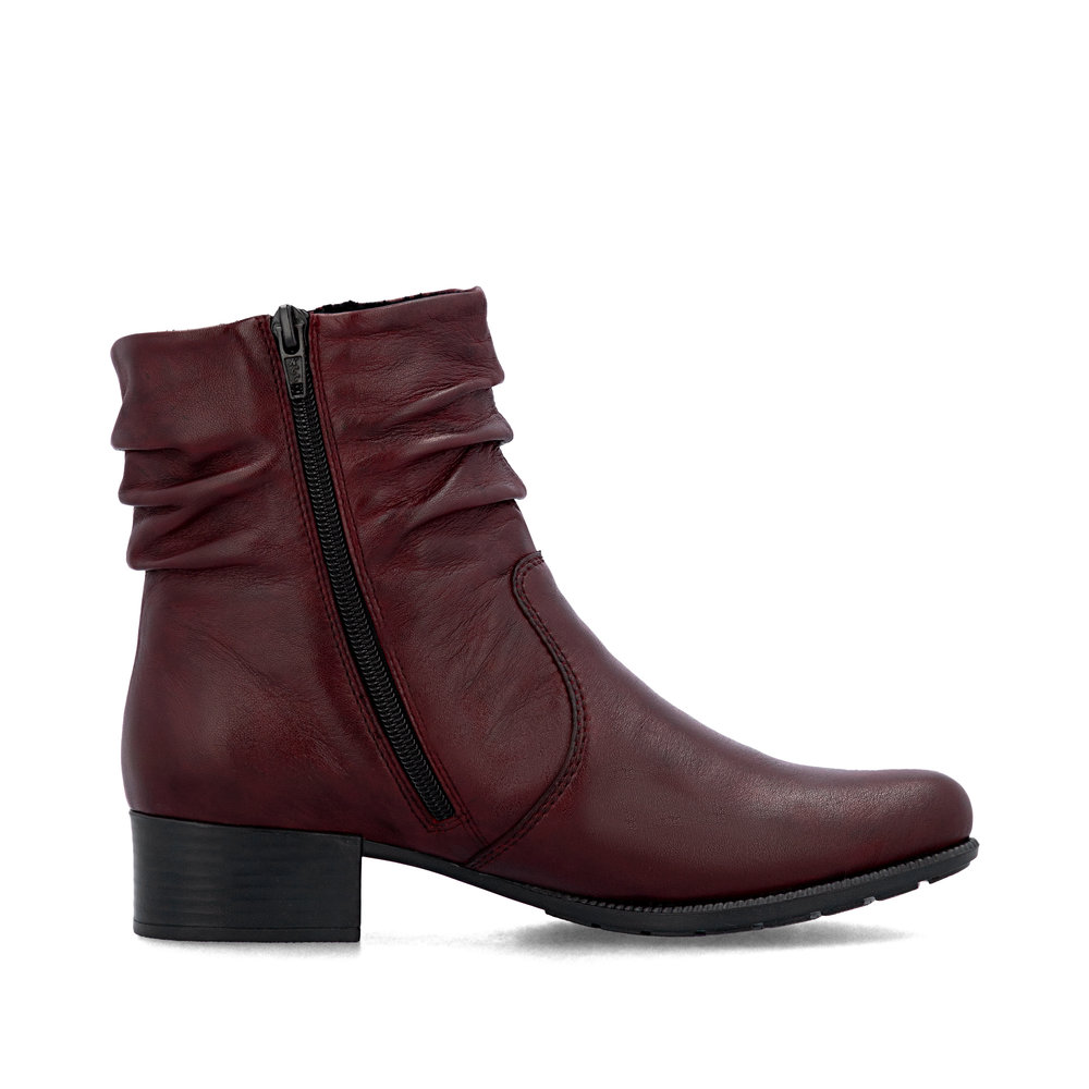Dámská kotníková obuv na podpatku ve vínové barvě značky Rieker. Z boku obuvi dva funkční zipy. Obuv je lehce zateplená. Podešev je díky technologii Antistress lehká, flexibilní, absorbuje nárazy při došlapu a snadno se přizpůsobí každé noze.