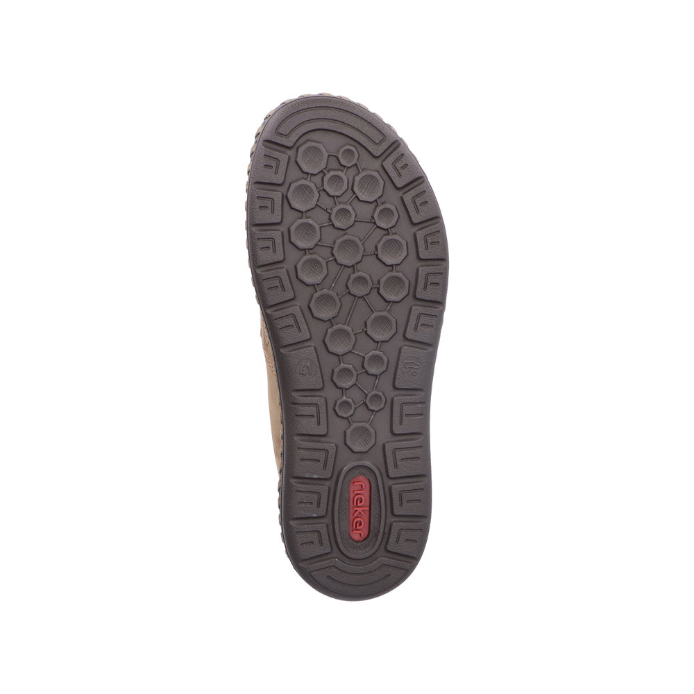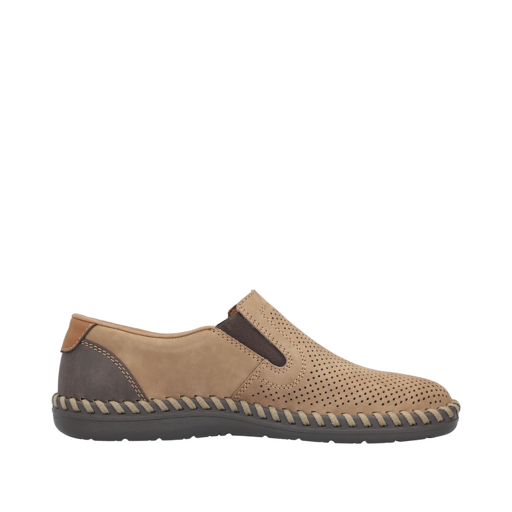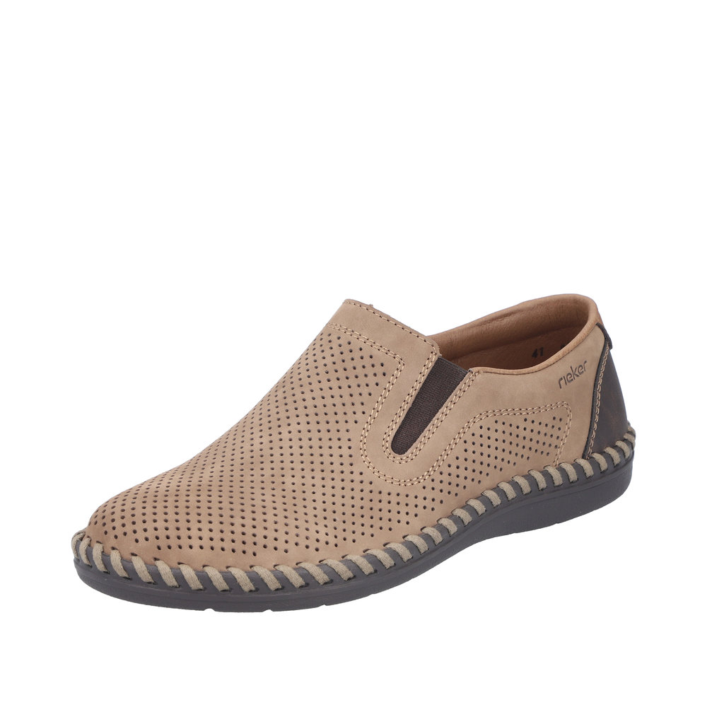 Pánské perforované mokasíny v hnědé barvě značky Rieker. Obuv je v šíři H - vhodná i pro širší chodidlo. Měkká kožená stélka je vyrobena z unikátní paměťové pěny, která se maximálně přizpůsobí tvaru Vašeho chodidla. Pro snadné obouvání jsou po stranách vsazeny pružné gumičky. Podešev je díky technologii Antistress lehká, flexibilní, absorbuje nárazy při došlapu a snadno se přizpůsobí každé noze. Tento pohodlný model je vhodný na běžné každodenní nošení a hodí se ke každému outfitu.