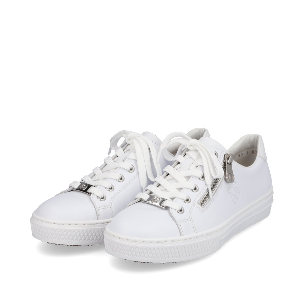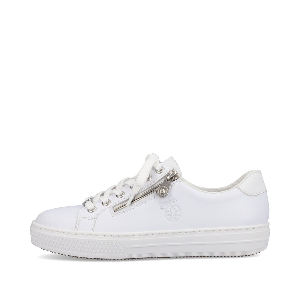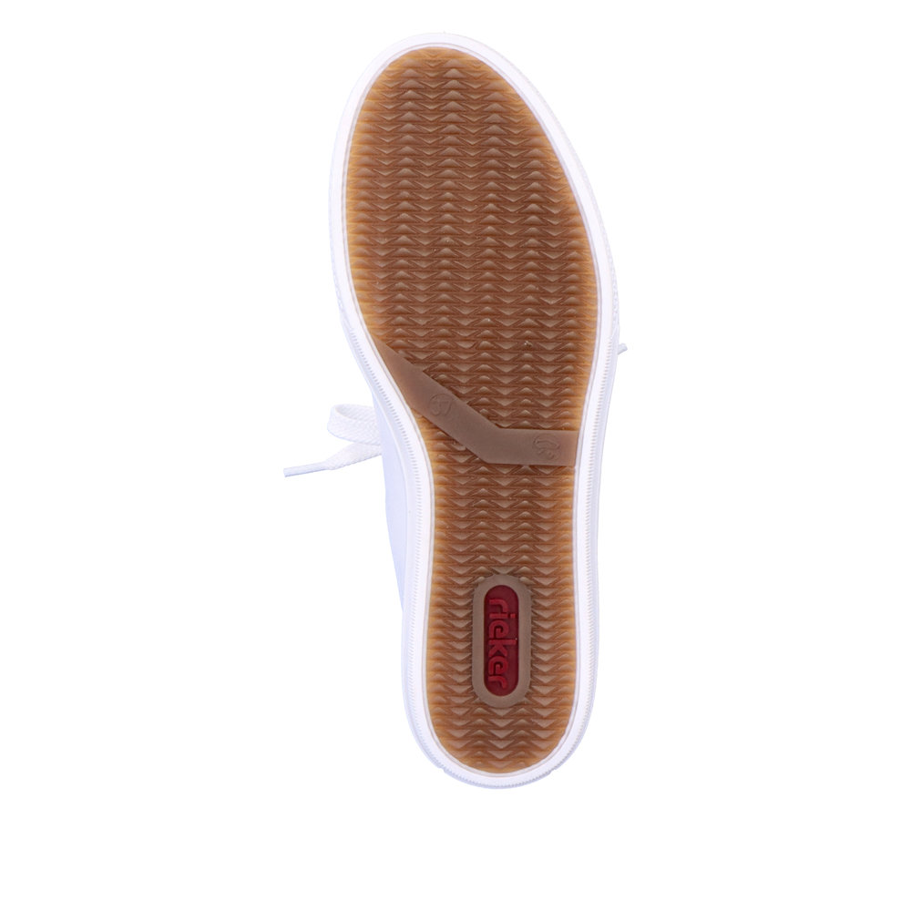 Dámské šněrovací bílé tenisky značky Rieker. Svršek boty je vyroben z kůže. Z boku obuvi funkční zip. Podešev je díky technologii Antistress lehká, flexibilní, absorbuje nárazy při došlapu a snadno se přizpůsobí každé noze. Obuv je vhodná pro každodenní nošení a je vybavená paměťovou stélkou.