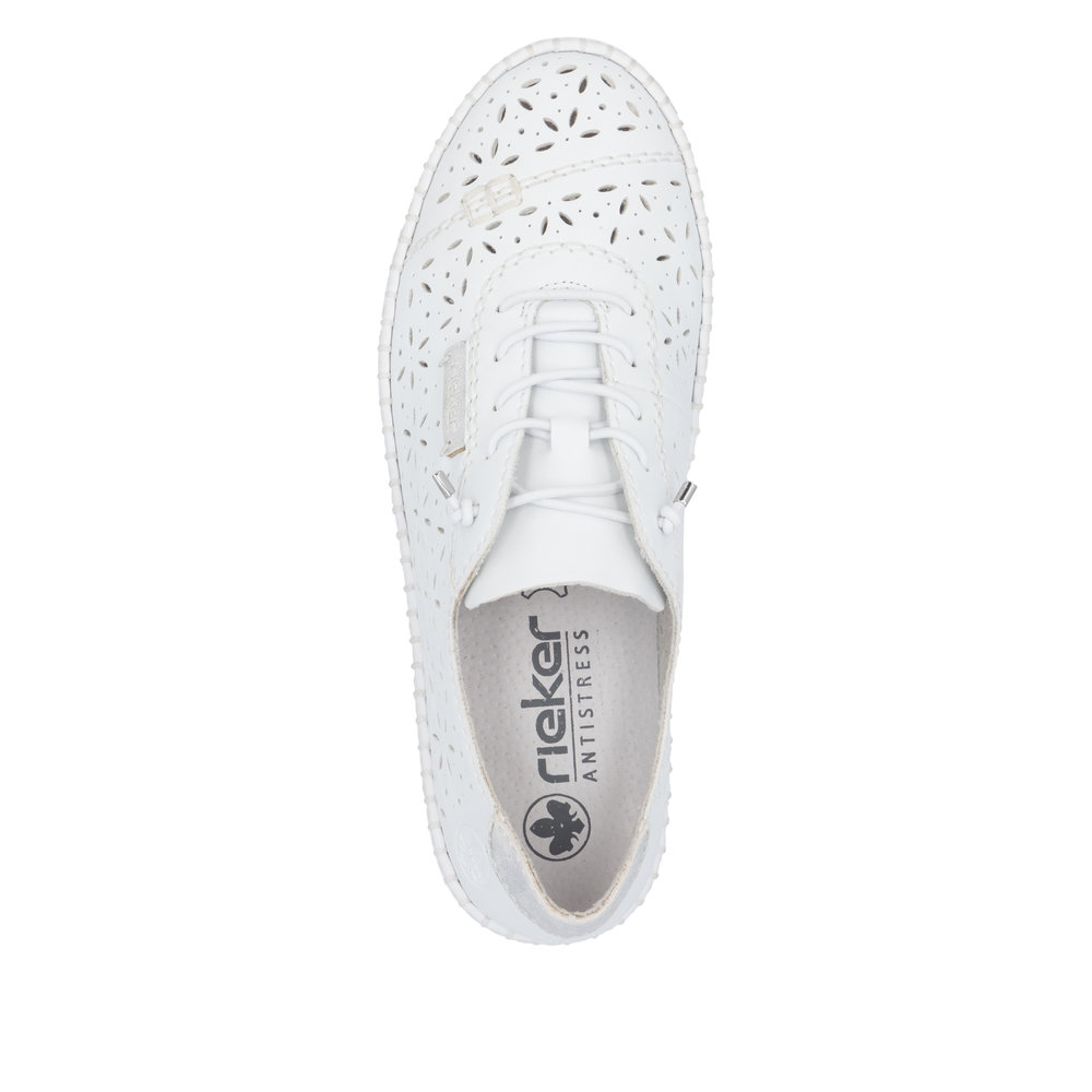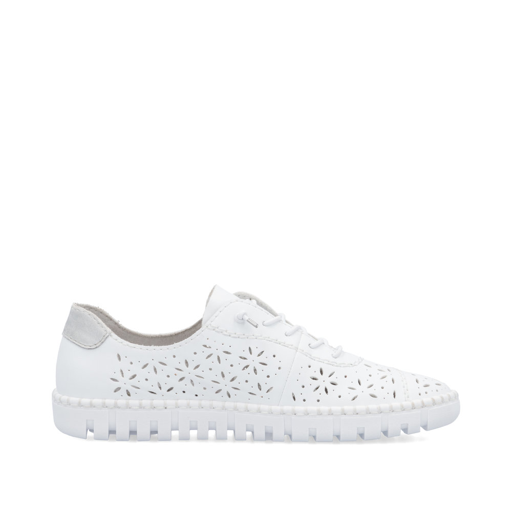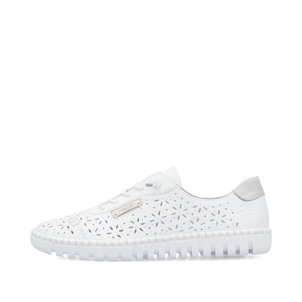 Dámské perforované tenisky v bílé barvě značky Rieker. Šněrování gumičkou umožňuje individuální nastavení a zajišťuje bezpečné a pohodlné nošení. Kožená stélka přispívá k celkovému komfortu a flexibilní podešev dodává teniskám lehkost a umožňuje snadný pohyb. Tyto tenisky jsou kombinací kvalitních materiálů, designu a pohodlí.