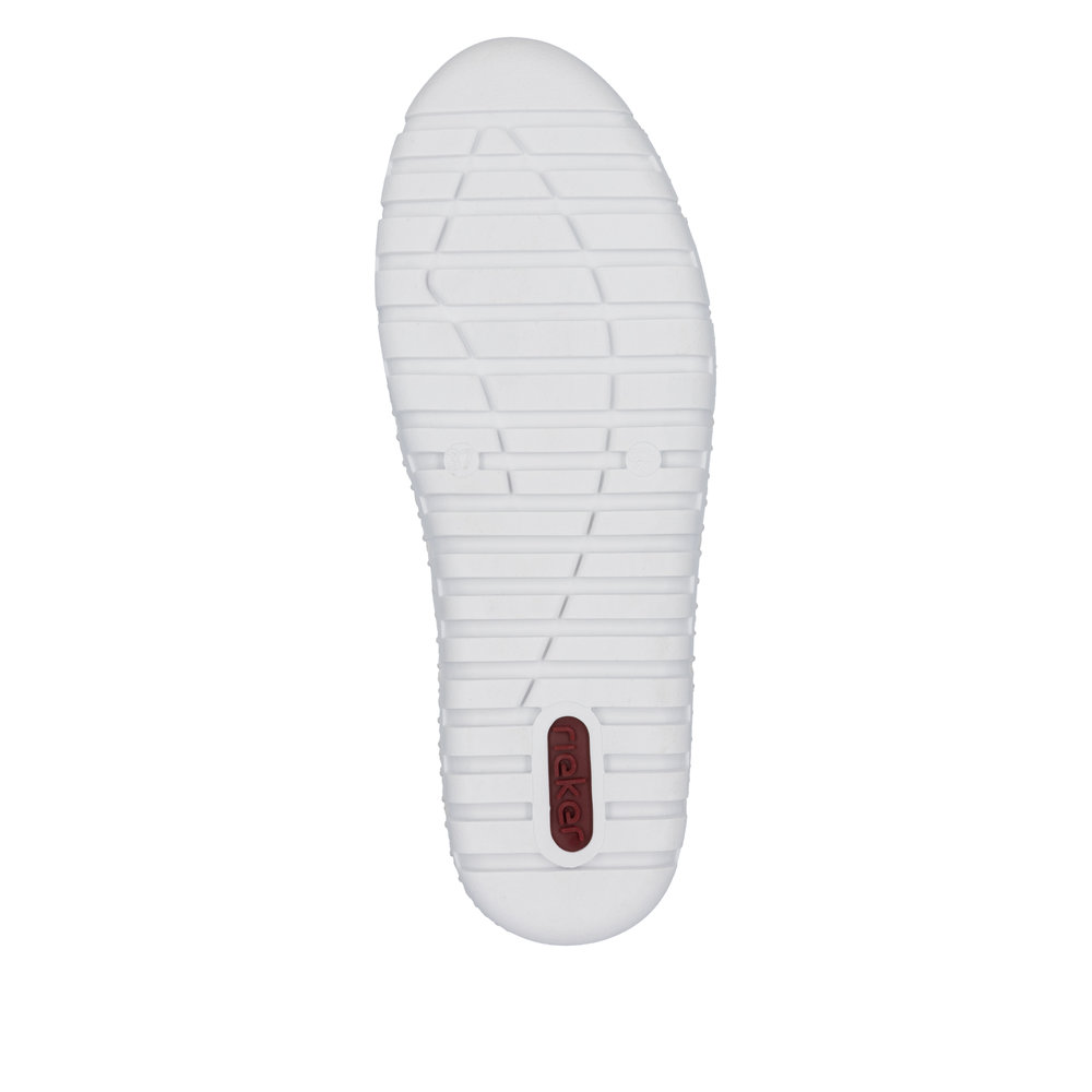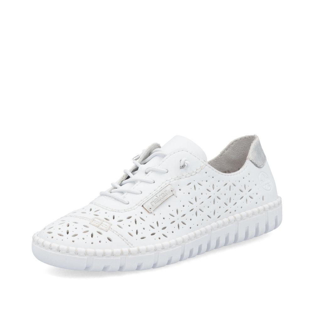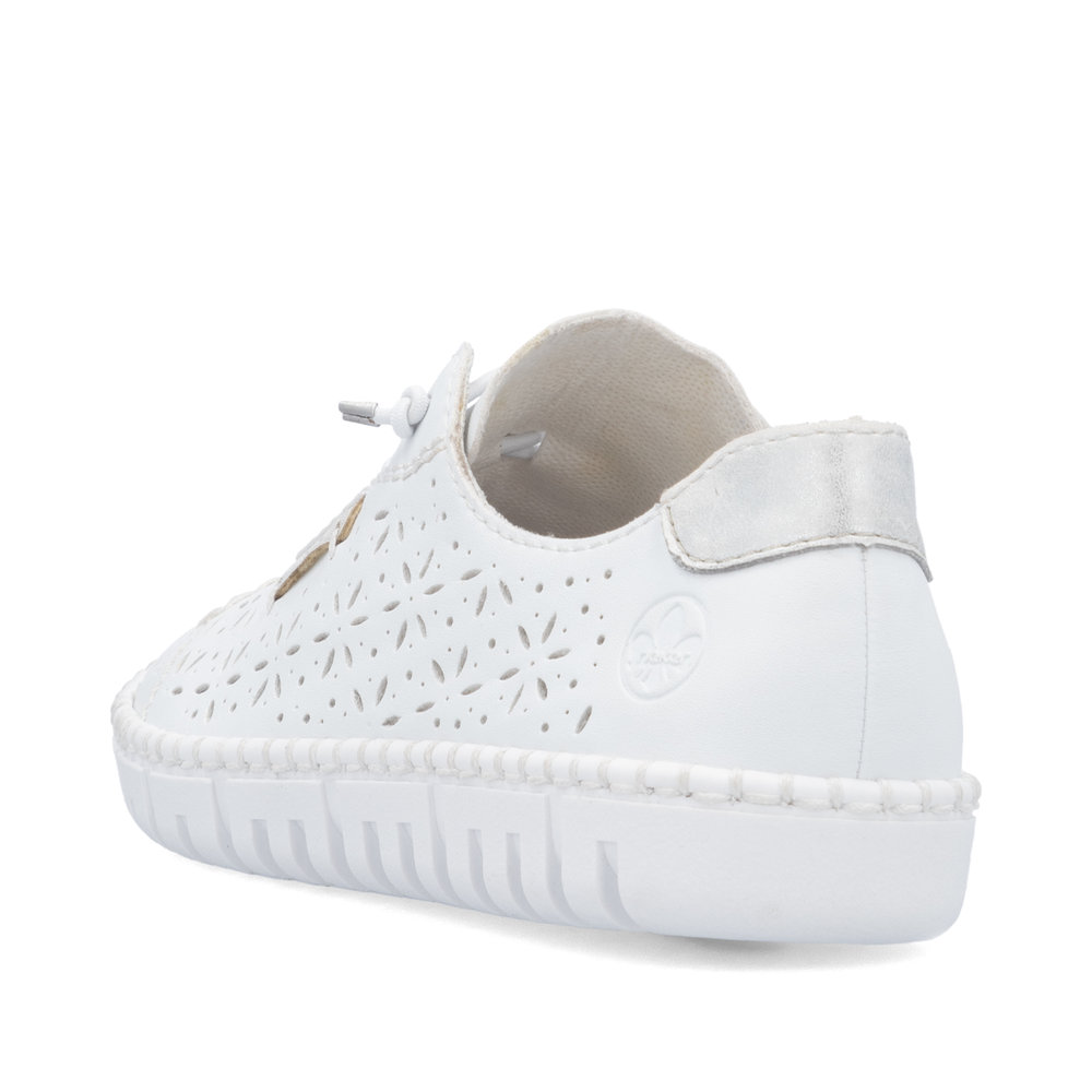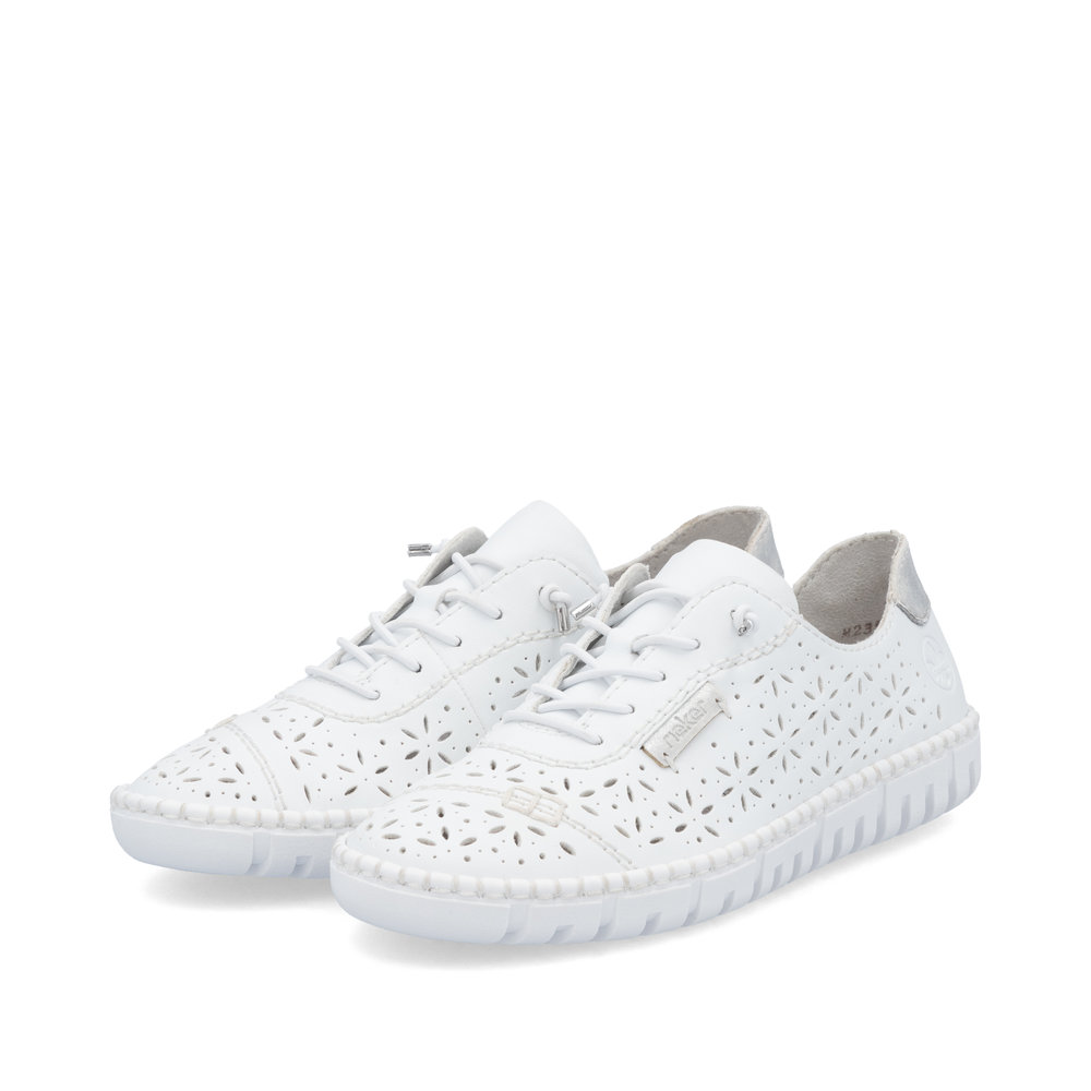 Dámské perforované tenisky v bílé barvě značky Rieker. Šněrování gumičkou umožňuje individuální nastavení a zajišťuje bezpečné a pohodlné nošení. Kožená stélka přispívá k celkovému komfortu a flexibilní podešev dodává teniskám lehkost a umožňuje snadný pohyb. Tyto tenisky jsou kombinací kvalitních materiálů, designu a pohodlí.