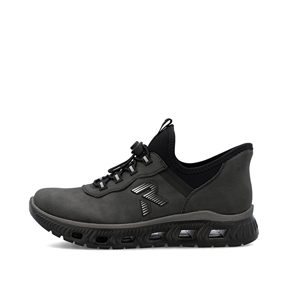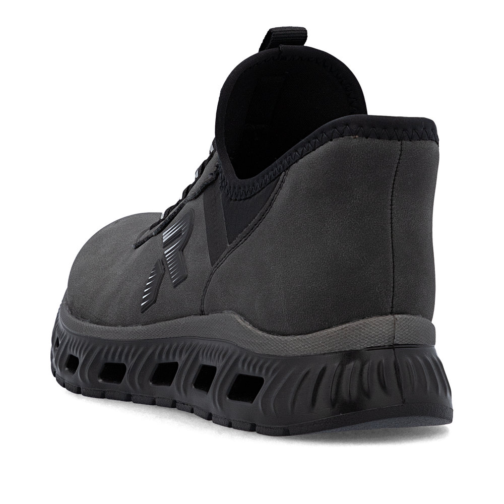 Tenisky RIEKER jsou ideální volbou pro komfortní obutí. Stélka z paměťové pěny se přizpůsobí tvaru vaší nohy a poskytne pohodlí při každém kroku. Svršek tmavé barvy je dekorován výrazným logem značky, které vystihuje jedinečnost těchto bot. Jednoduché a rychlé obutí zajistí pružný lem horního okraje a zpevněná část paty. Gumička se stahovacím prvkem je zde pouze věcí designu. Podešev zaujme svým unikátním designem a navíc poskytuje nárazy tlumící technologii. Lehký krok a příjemný pocit jsou zaručeny, ať už na procházce městem nebo během celodenního nošení.