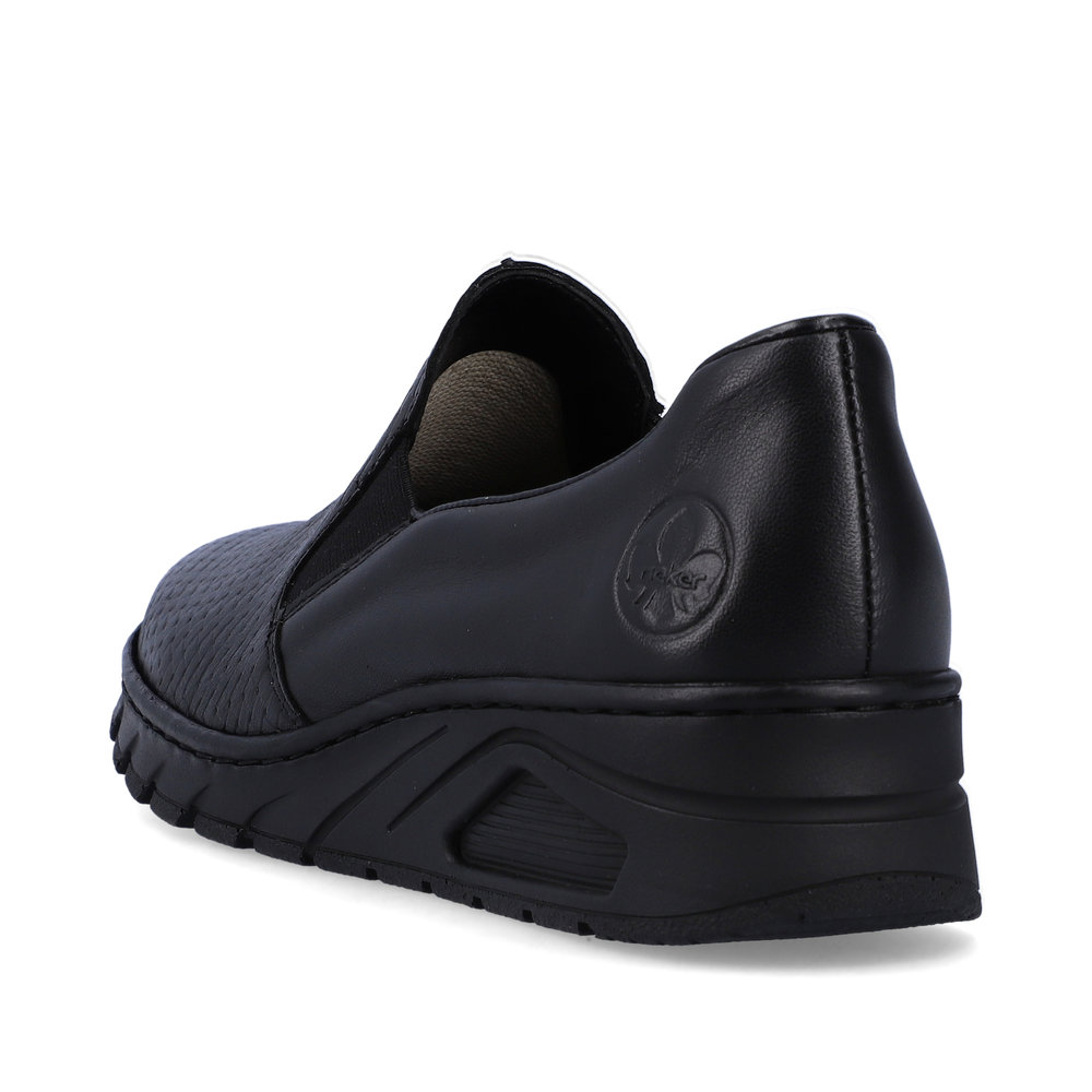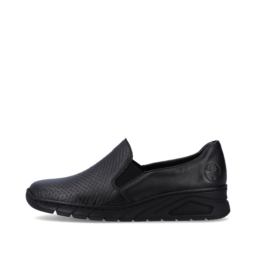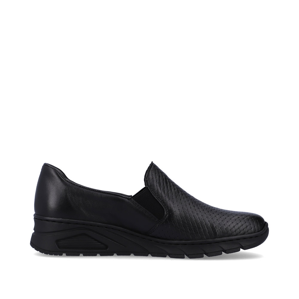 Dámské černé mokasíny na klínku značky Rieker. Svrchním materiálem je kůže. Podešev je flexibilní a díky systému Antistress skvěle tlumí nárazy a otřesy. Díky vsazeným gumičkám po stranách se obuv snadno nazouvá.