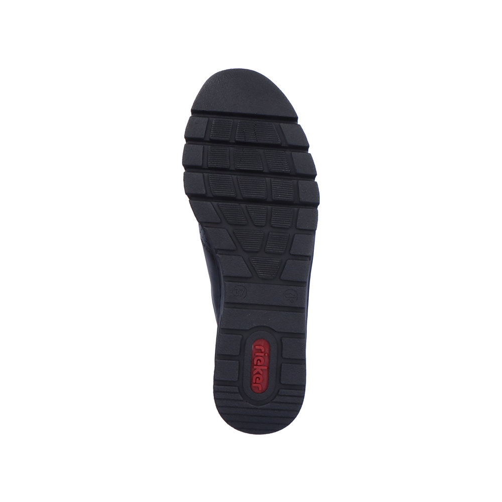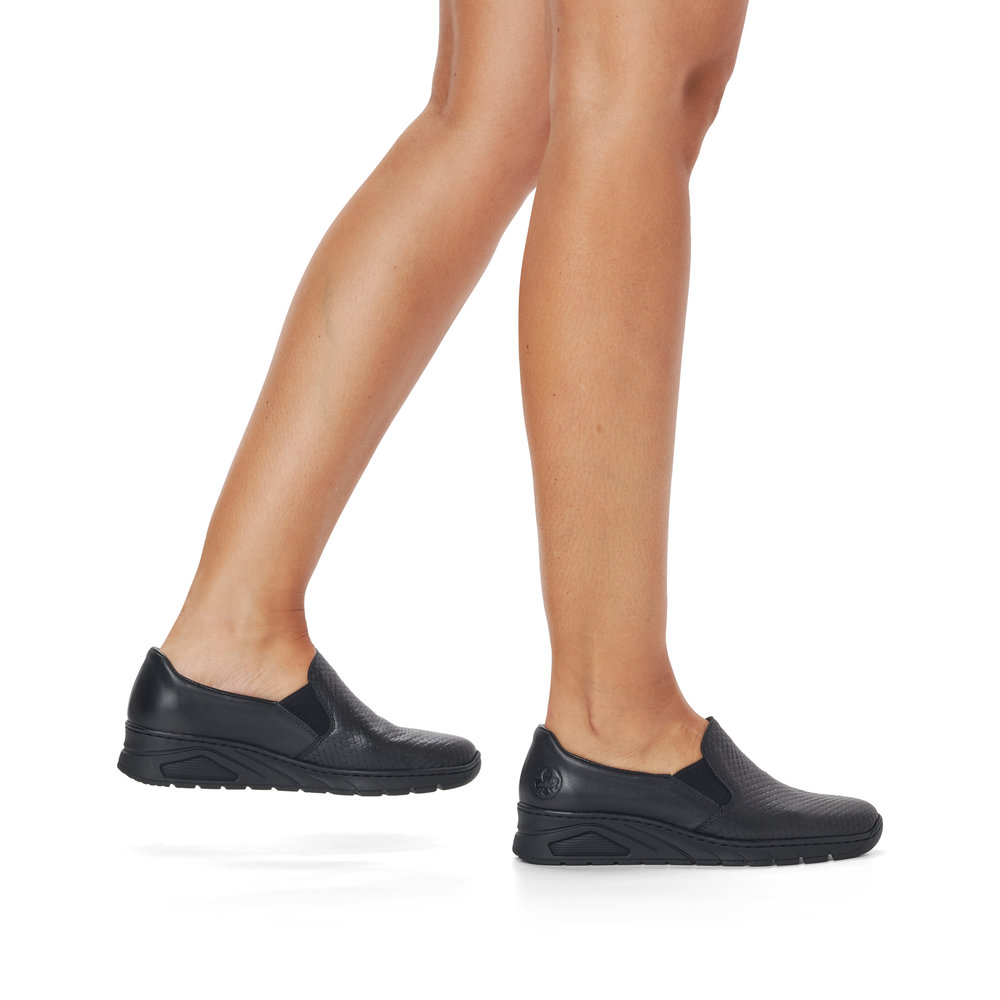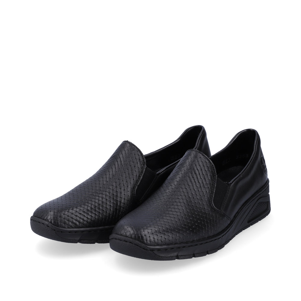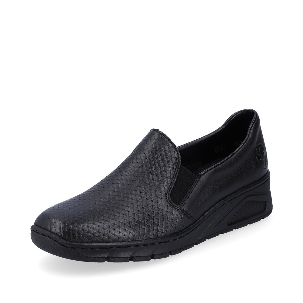 Dámské černé mokasíny na klínku značky Rieker. Svrchním materiálem je kůže. Podešev je flexibilní a díky systému Antistress skvěle tlumí nárazy a otřesy. Díky vsazeným gumičkám po stranách se obuv snadno nazouvá.