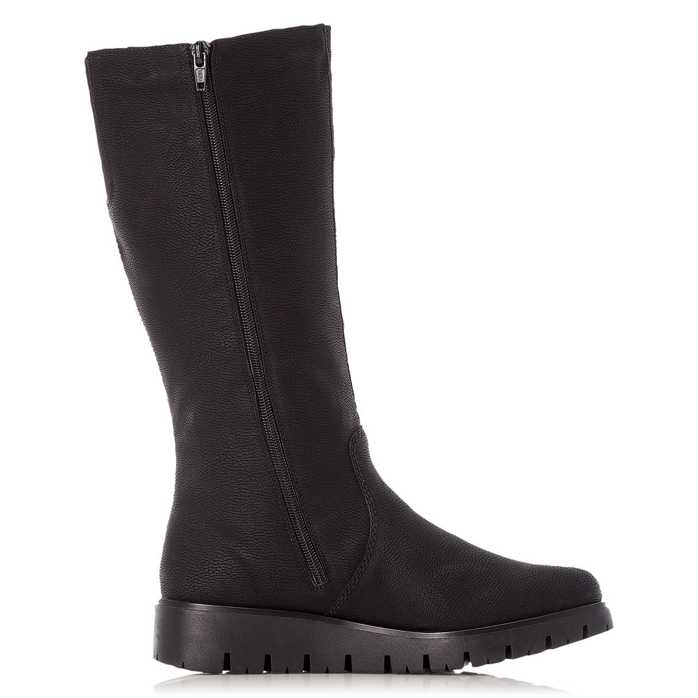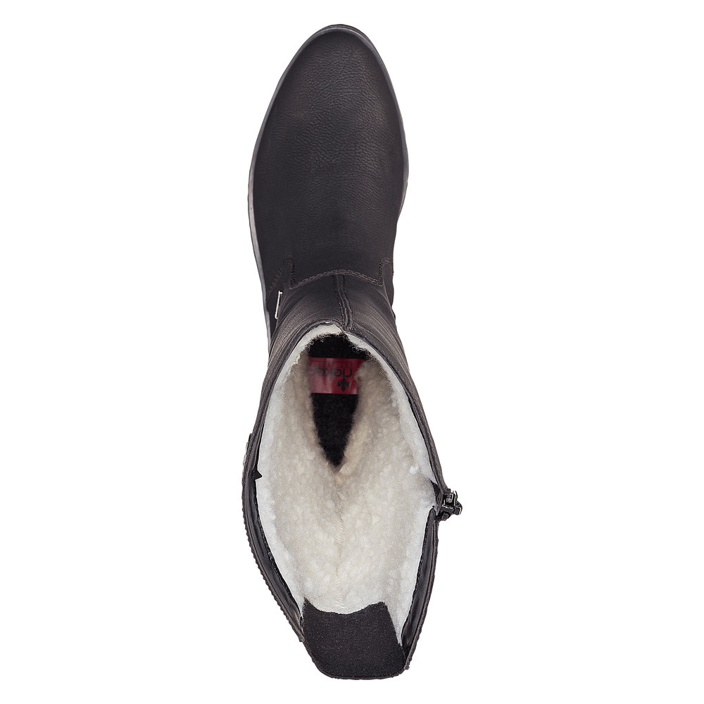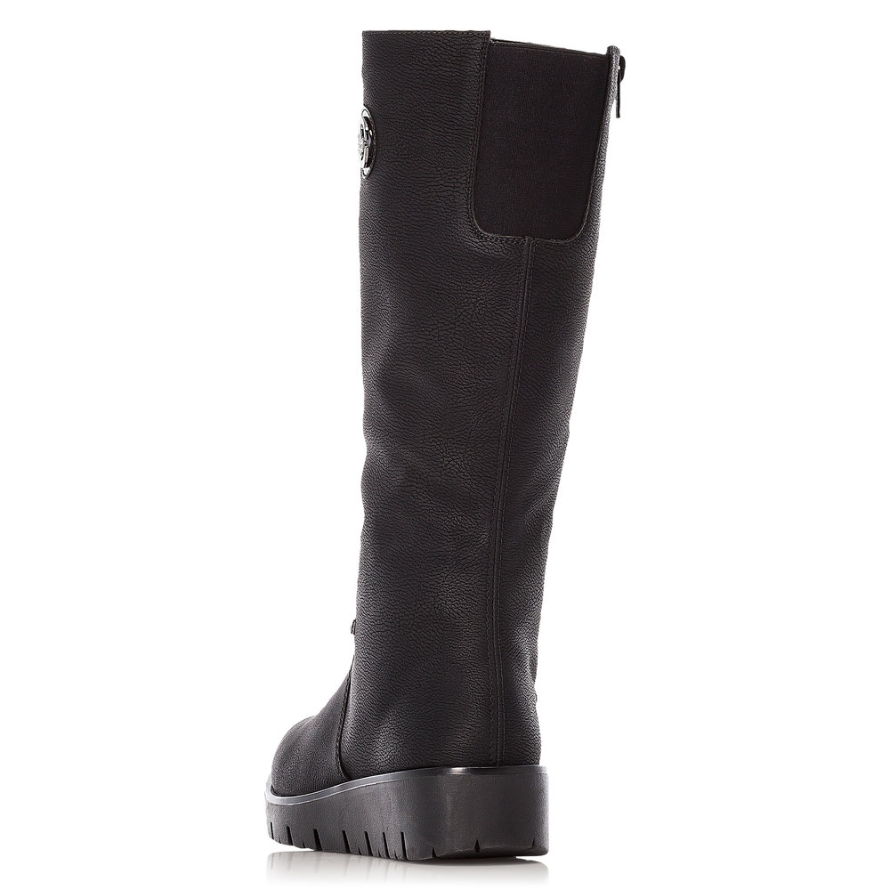 Dámské lepené kozačky černé barvy jsou vyrobeny ze syntetického materiálu. Díky membráně RiekerTex jsou voděodolné a prodyšné. Částečné zvětšení obvodu, k přizpůsobení se lýtka, zajistí vsazená gumička. Obuv je vyteplená podšívkou z ovčí vlny s delším chloupkem. Podešev je lehká, flexibilní, tlumí nárazy při chůzi a přizpůsobí se každé noze.