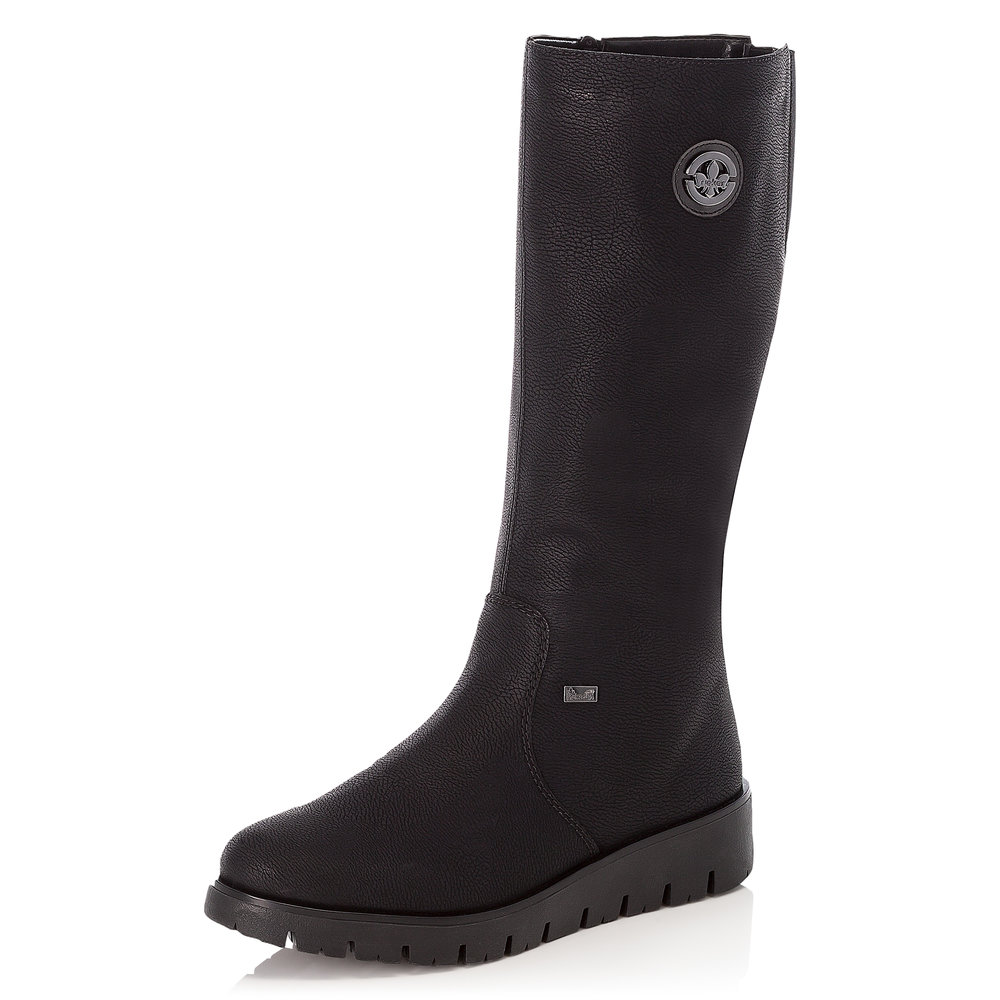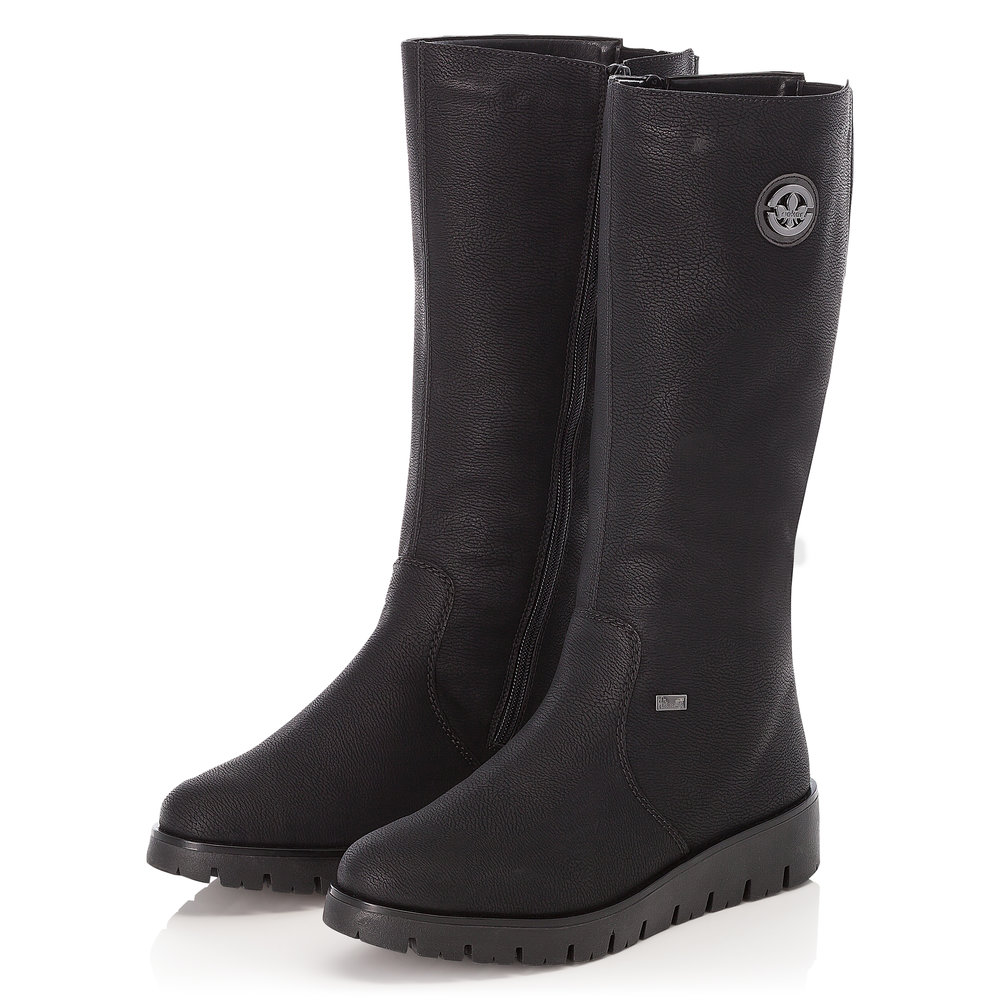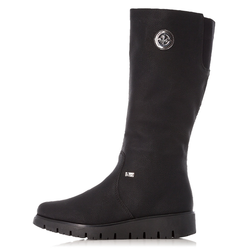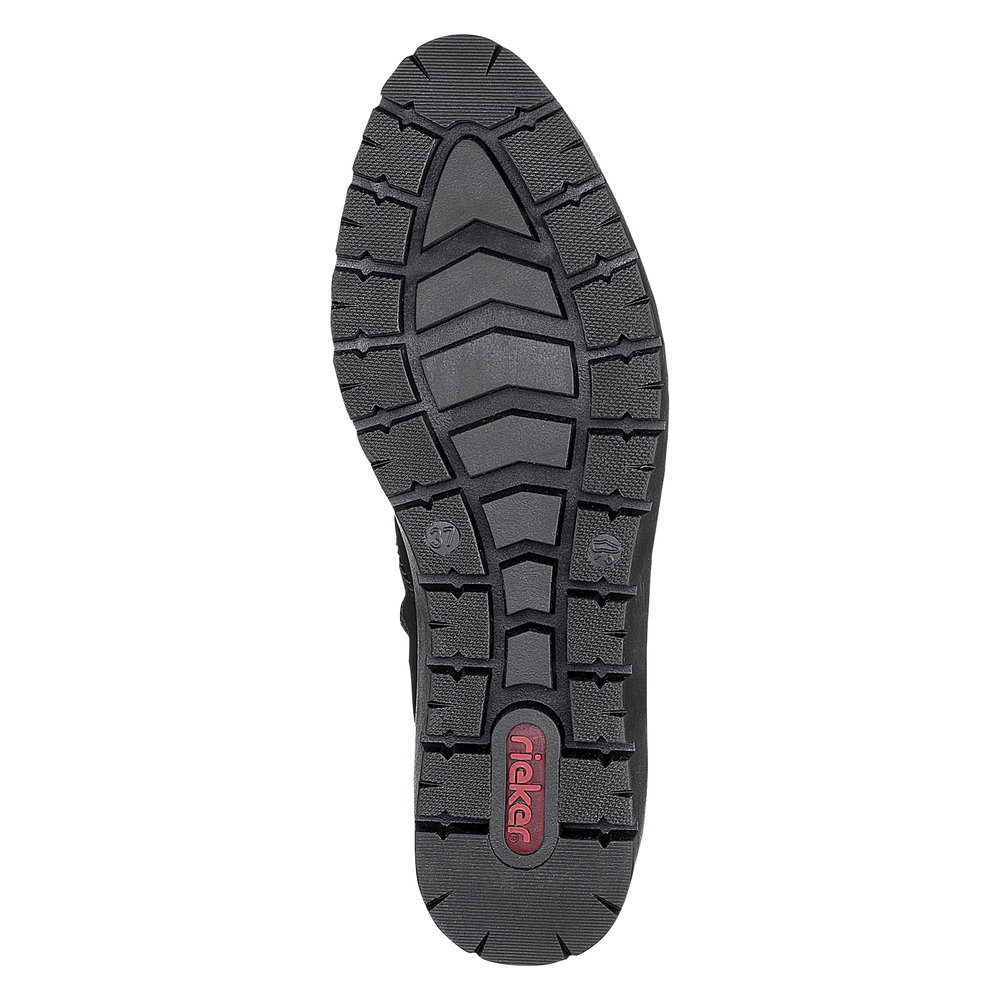 Dámské lepené kozačky černé barvy jsou vyrobeny ze syntetického materiálu. Díky membráně RiekerTex jsou voděodolné a prodyšné. Částečné zvětšení obvodu, k přizpůsobení se lýtka, zajistí vsazená gumička. Obuv je vyteplená podšívkou z ovčí vlny s delším chloupkem. Podešev je lehká, flexibilní, tlumí nárazy při chůzi a přizpůsobí se každé noze.