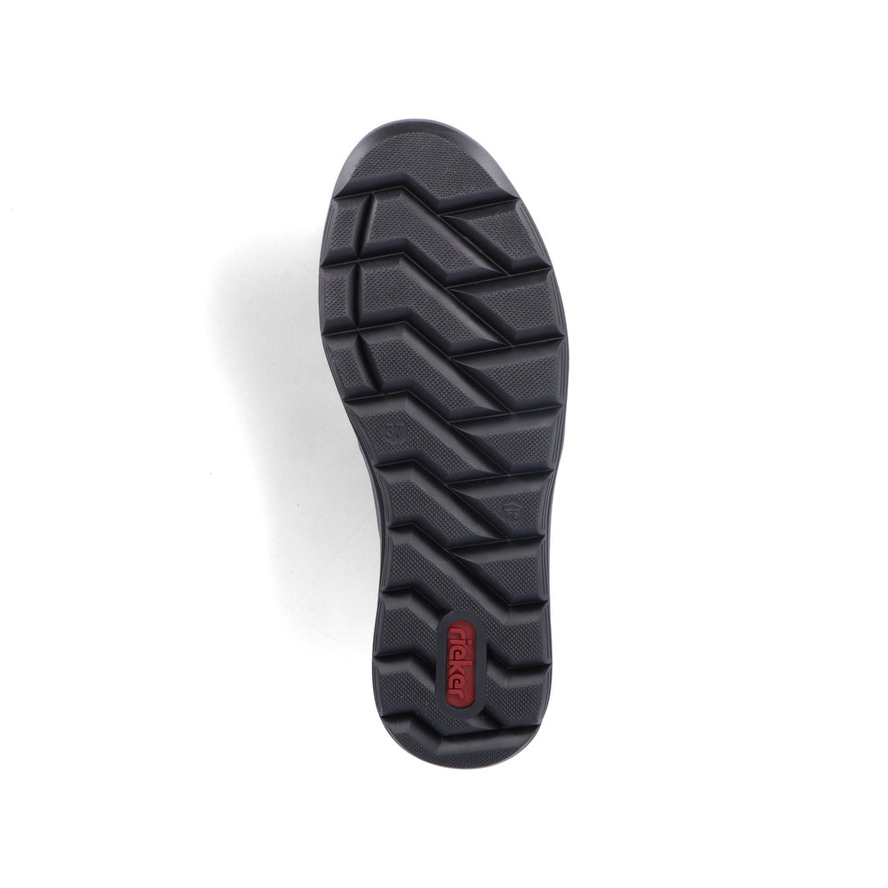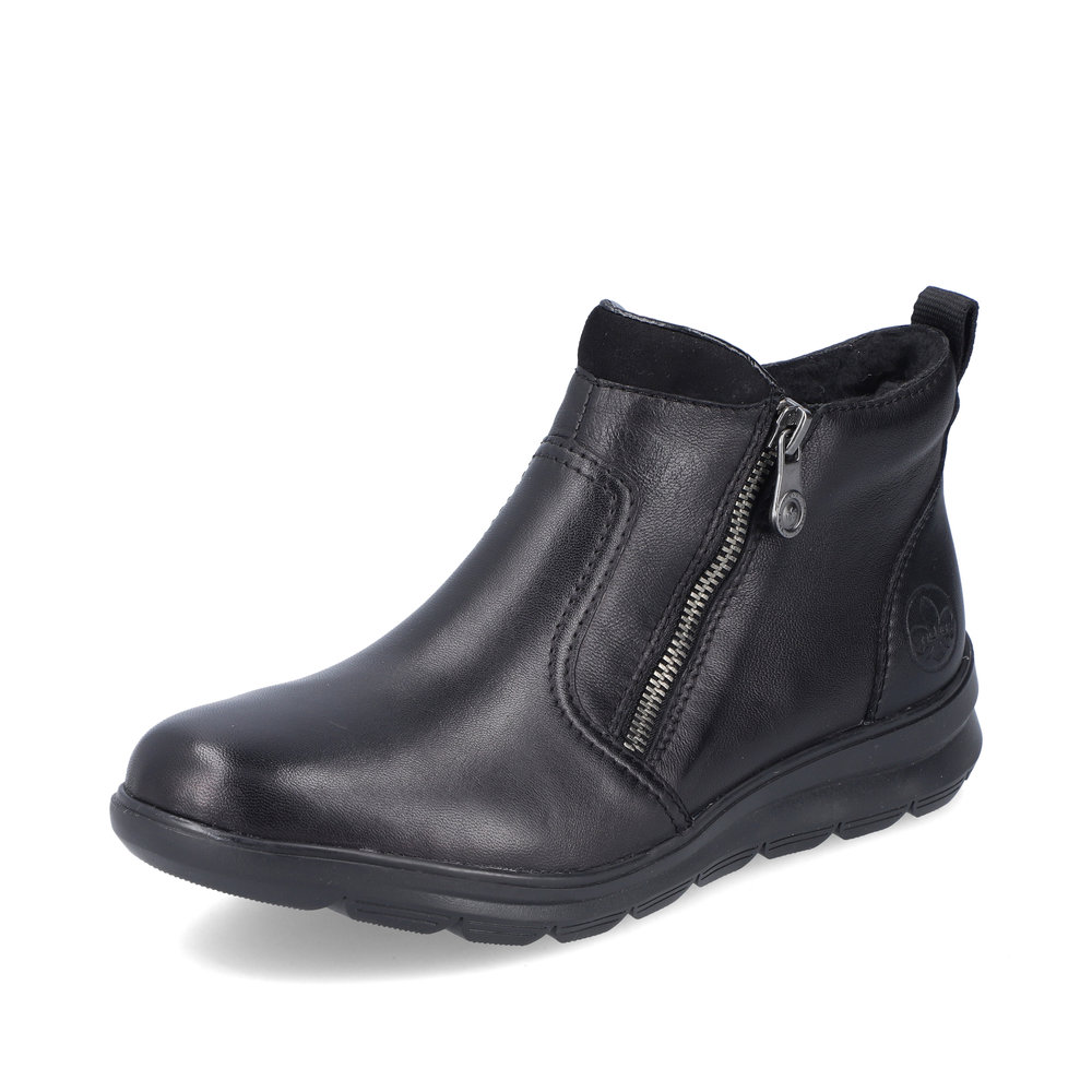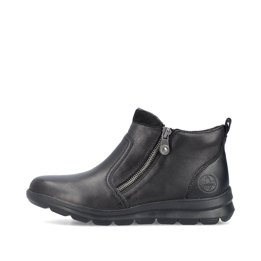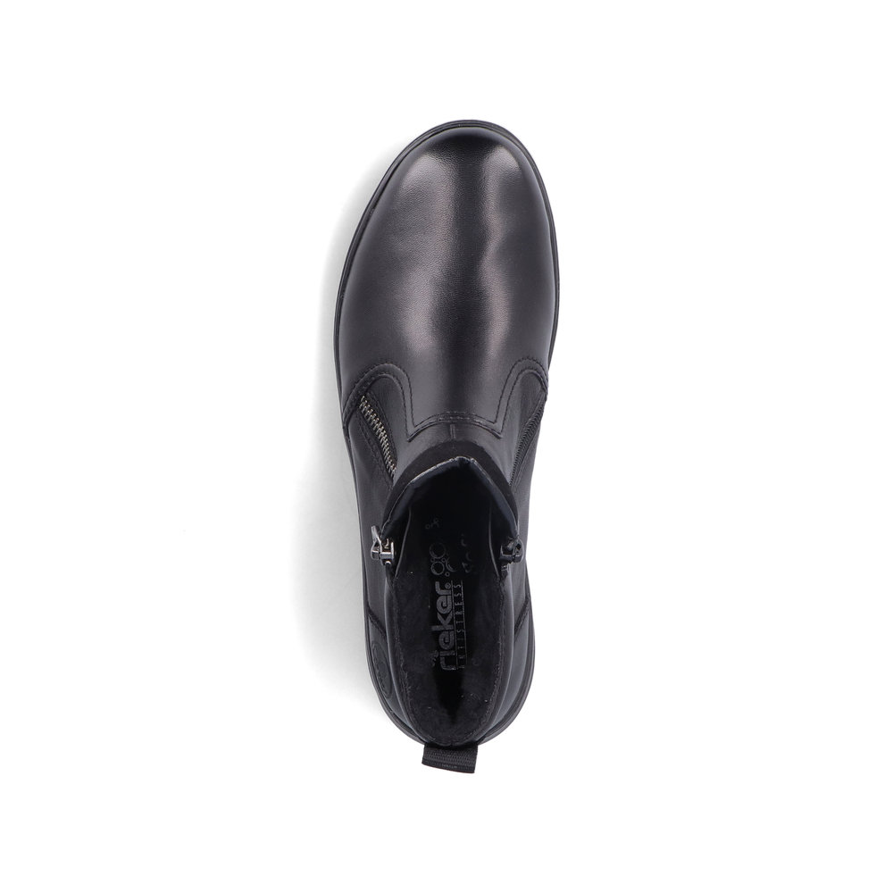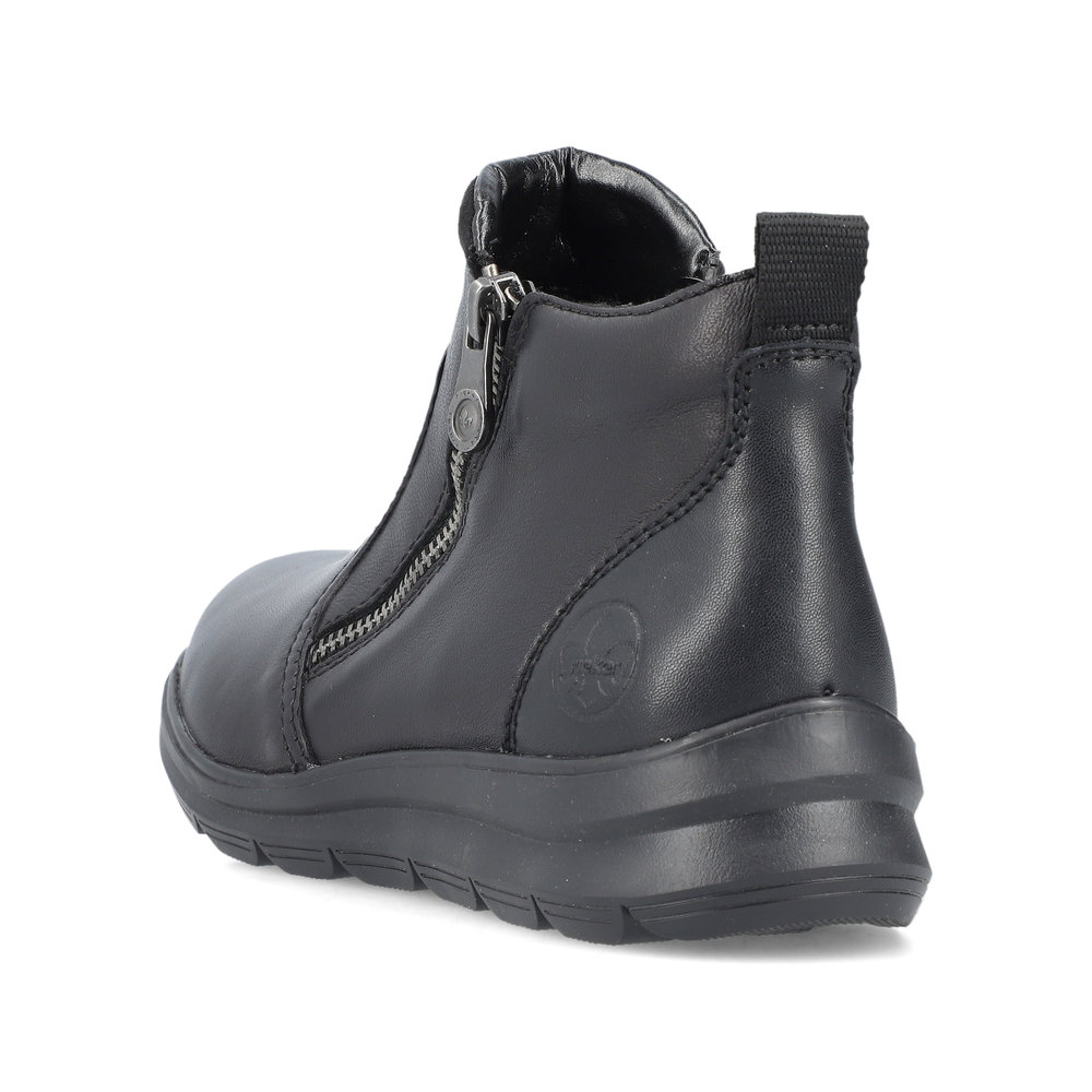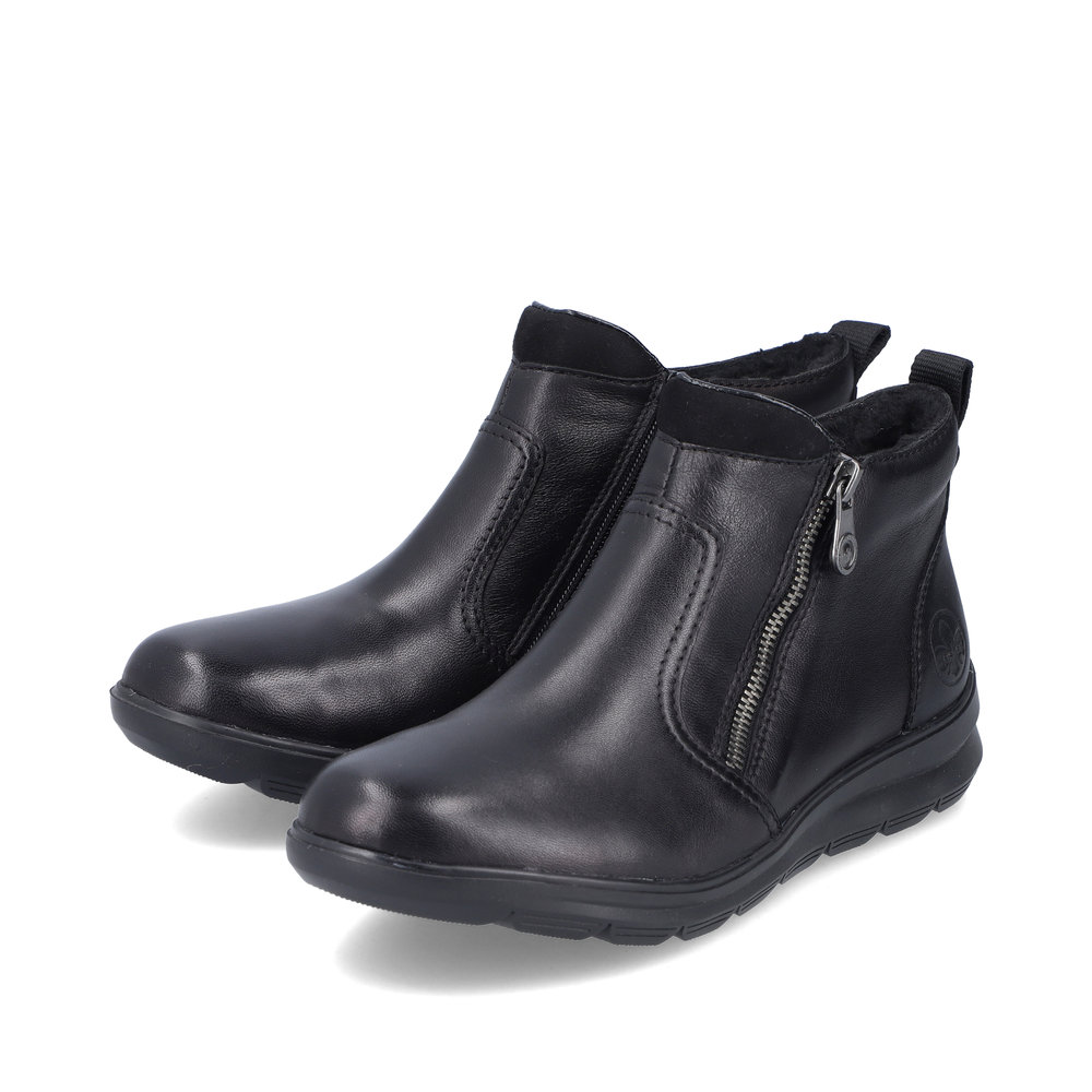 Dámské zateplené kožené polobotky v černé barvě značky Rieker. Vnitřní stélka je paměťová a je vyjímatelná. Hrubší vzorek podešve zabrání smyku na kluzkém povrchu.