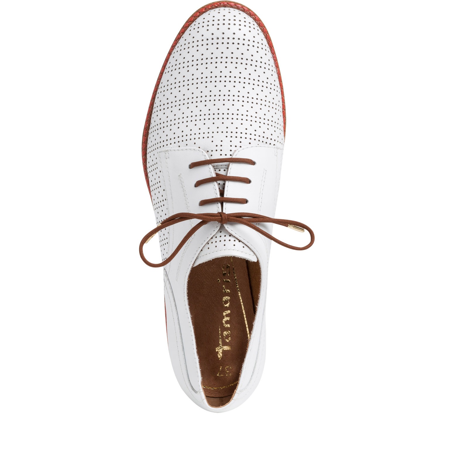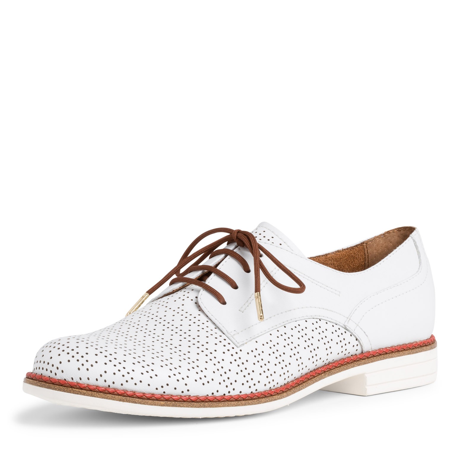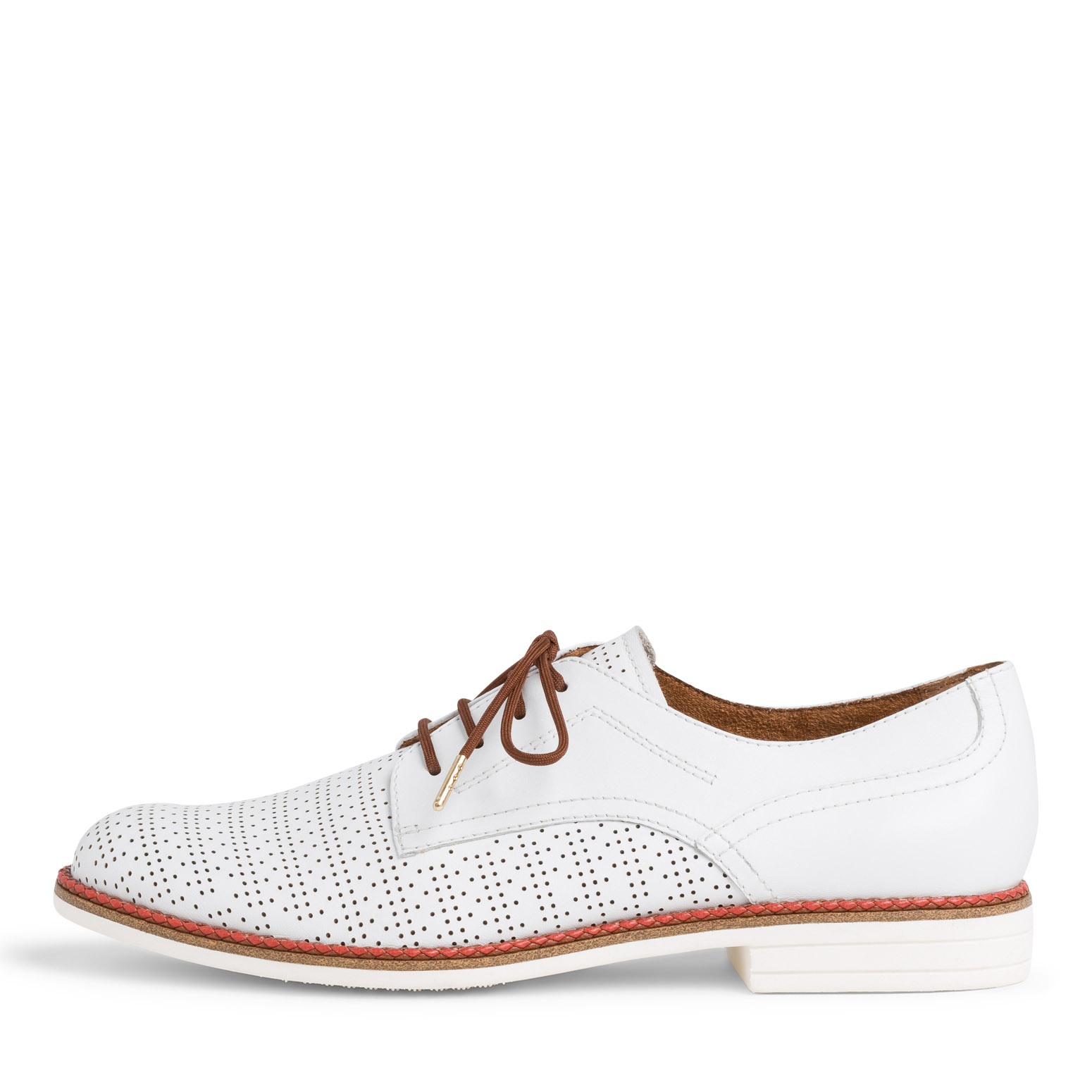 Dámské bílé polobotky s hnědými doplňky jsou vyrobeny z pravé kůže a zdobeny jemnou perforací ve špici. Díky šněrování si obuv sami upravíte přímo pro vaši nohu. Obuv má hladký povrch a kulatou špičku. Měkká stélka Touch It se dokonale přizpůsobí tvaru nohy a zajistí tak při chůzi optimální pohodlí.