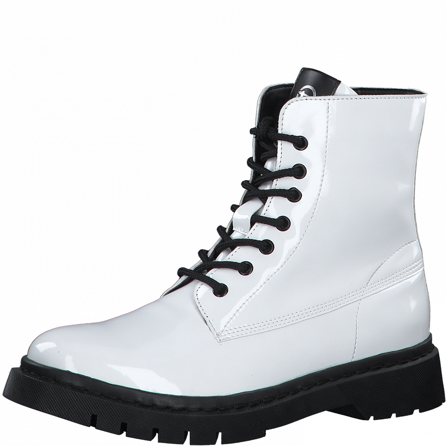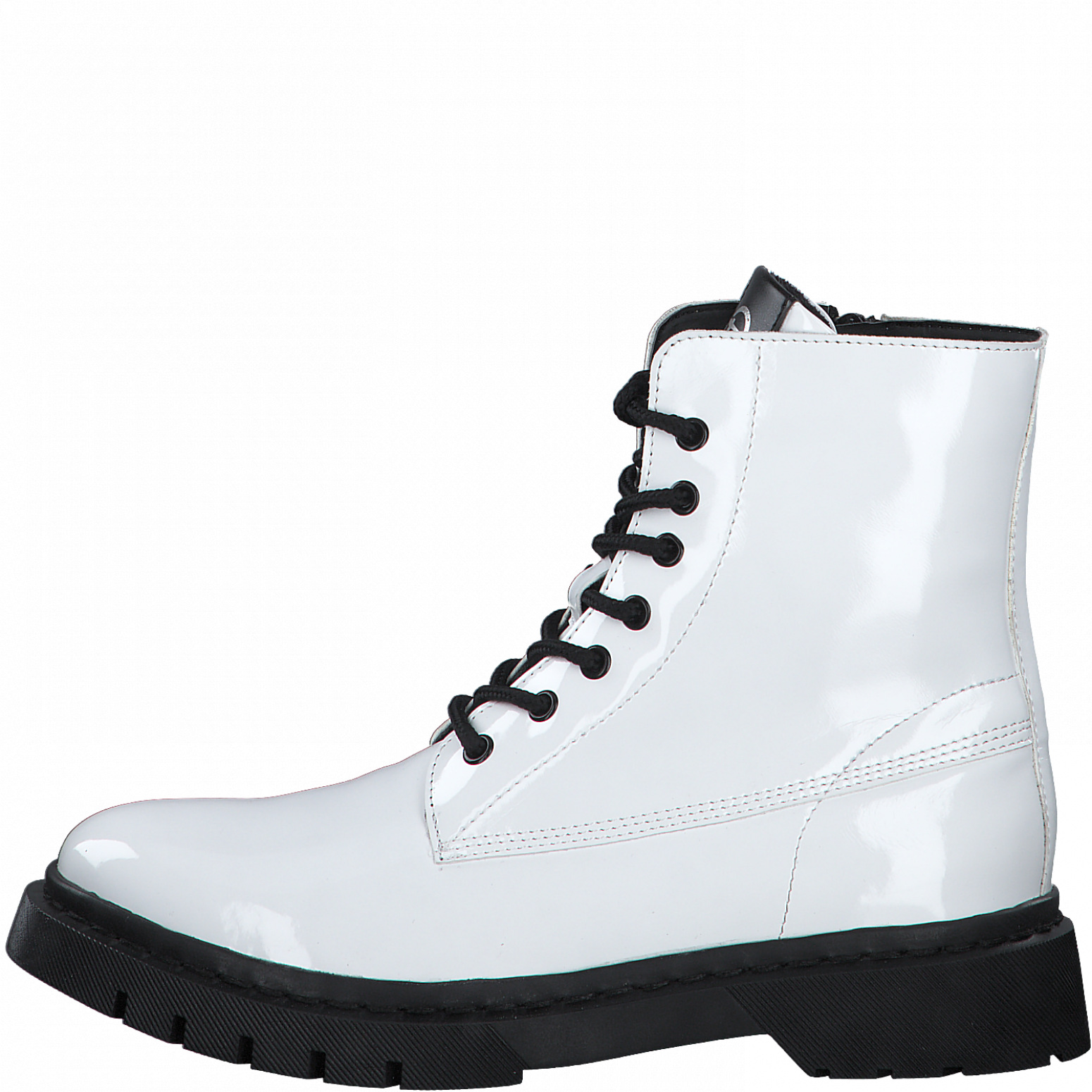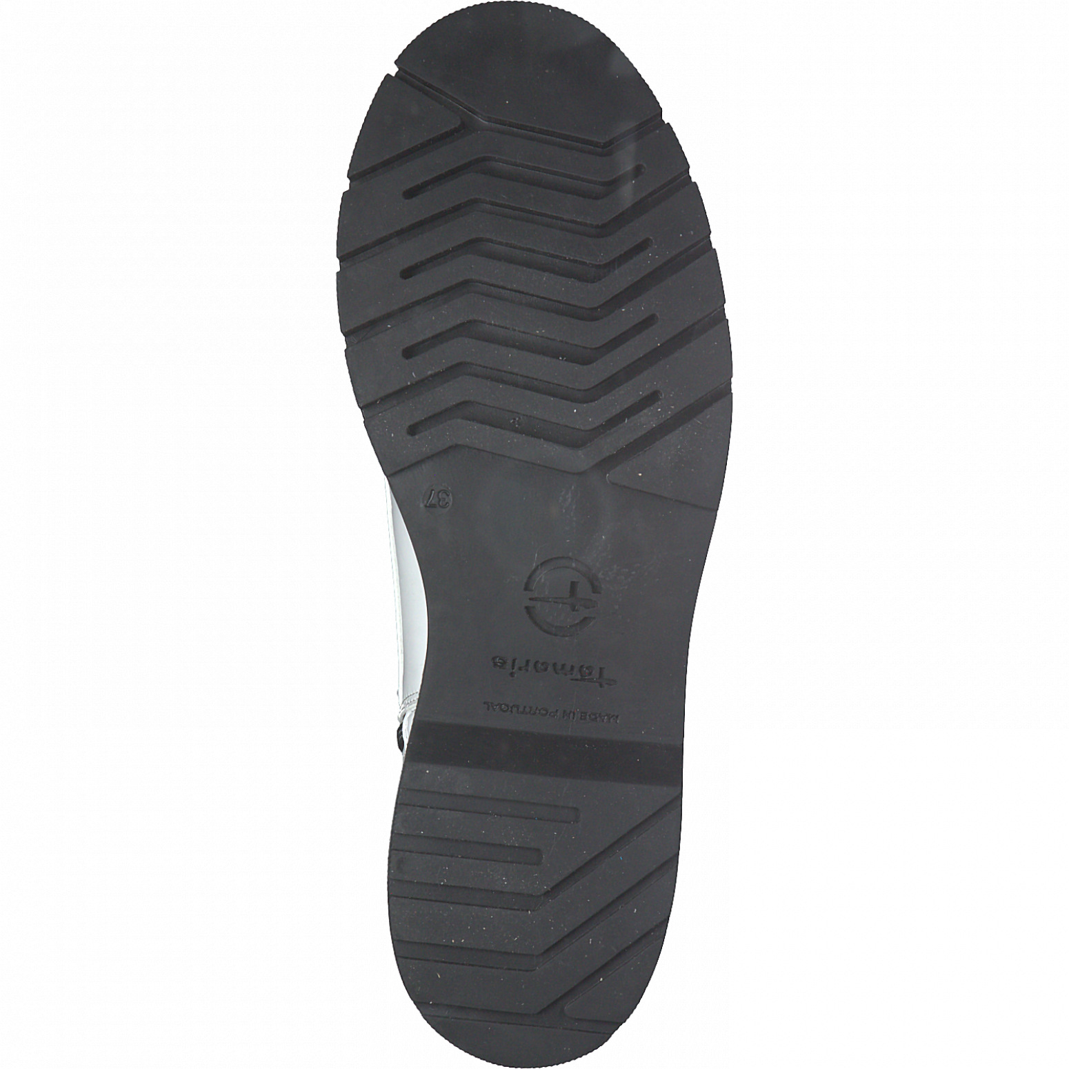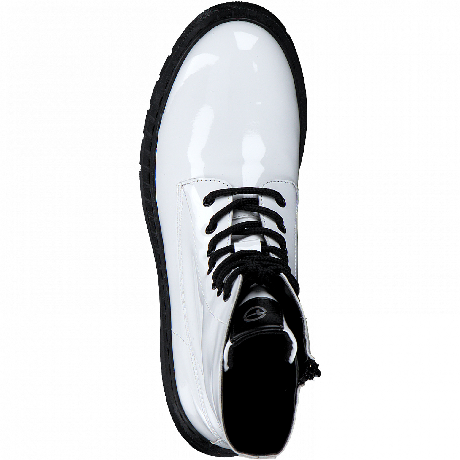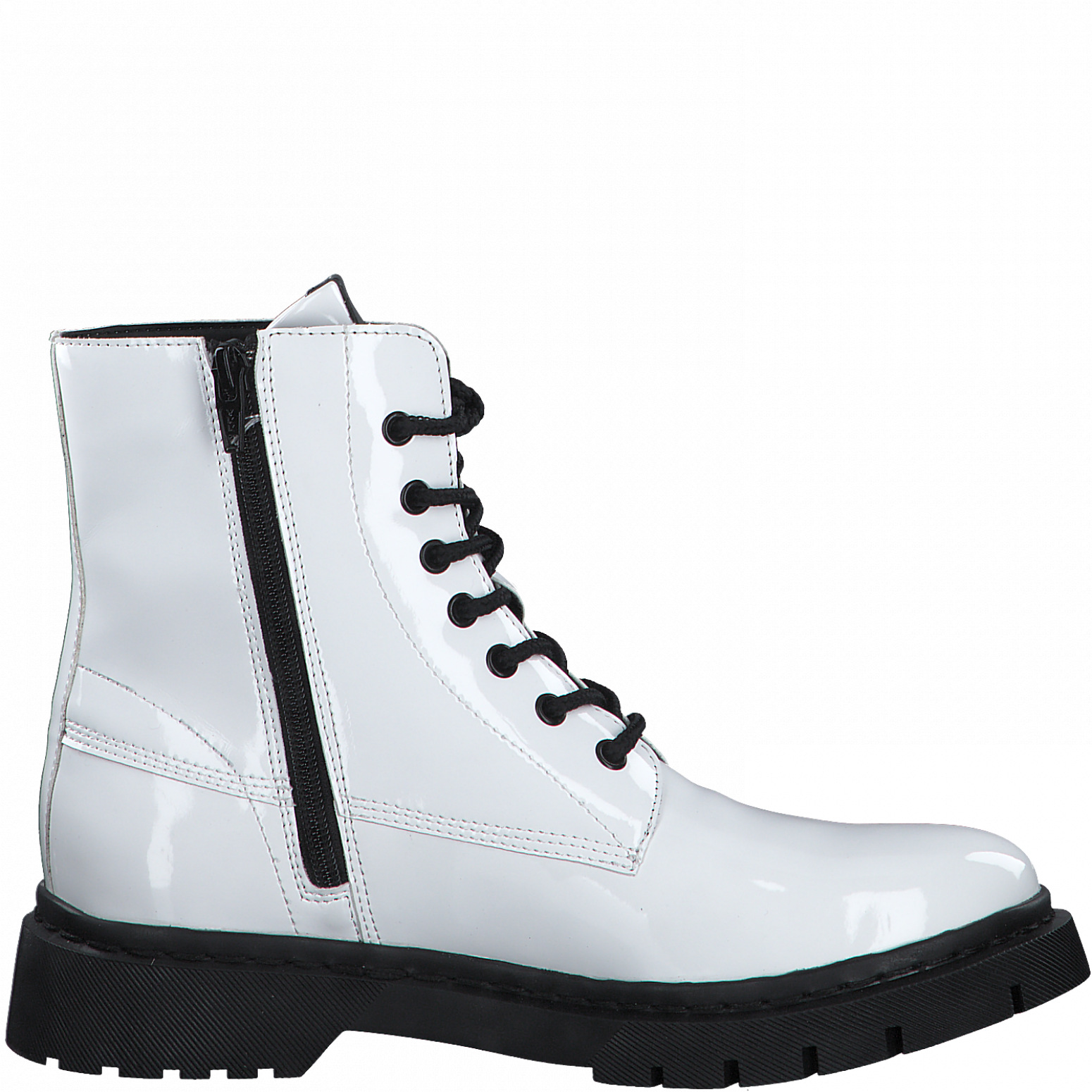 Dámská kotníková obuv v lesklé bílé barvě od značky Tamaris. Funkční zip na vnitřní straně společně se šněrováním usnadní nazouvání obuvi. Obuv má vyjímatelnou stélku vyrobenou z měkkého materiálu a je zateplená hřejivou podšívkou. Podešev s hrubším vzorkem doladí obuv k dokonalosti.